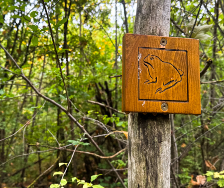 Unglaublich viele Hinweise, nebst Angaben der Länge auf Holzschildern und einem Logo.