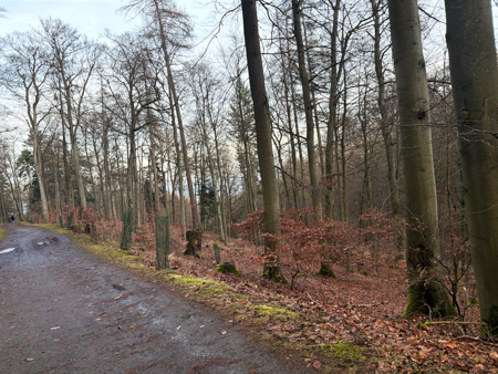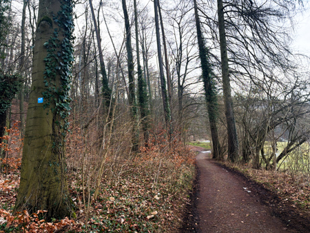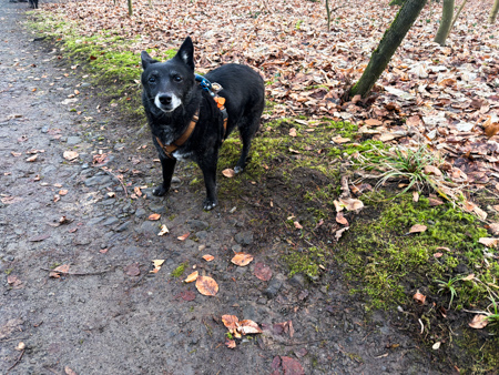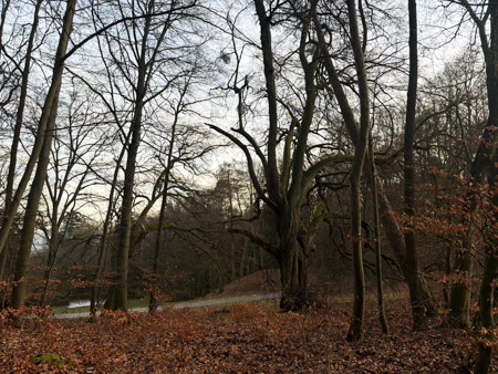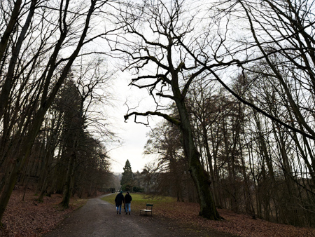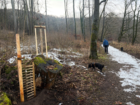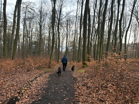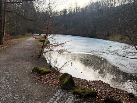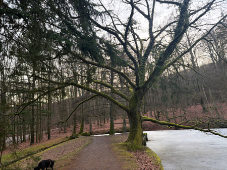 Mit Uwe und den Hundis bei noch ein weng gefrorenem Eis auf dem Wegen im Bergpark unterwegs.