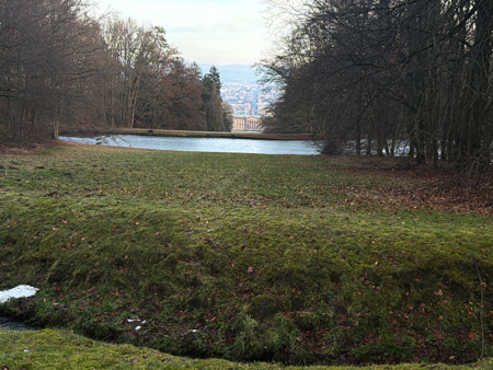 von oben: das Fontänenreservoir, dahinter das Schloß und Kassel