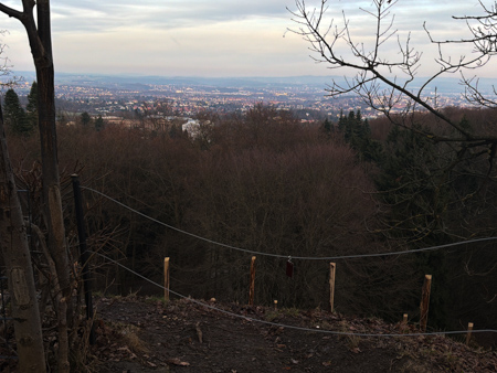 Hier stellten wir fest das die Wege noch gefroren waren, also bin ich, statt meine Spikes anzuziehen auf dem Gras hochgelaufen.