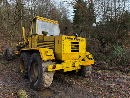 Ein älterer knickgelenkter Radlader / Wegebau-Traktor mit Planierschild, kein Kettenfahrzeug und kein moderner Bagger. |