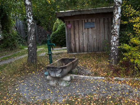 Eine Hütte im Wald mit einer Holzbadewanne und einem grünen Wasserhahn