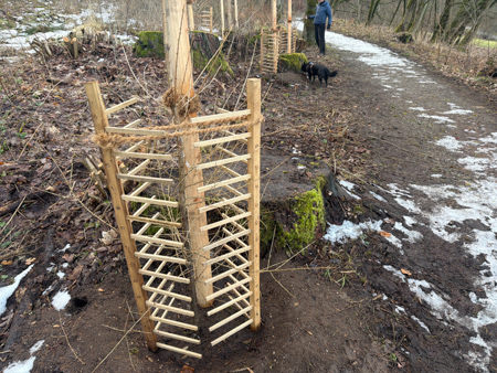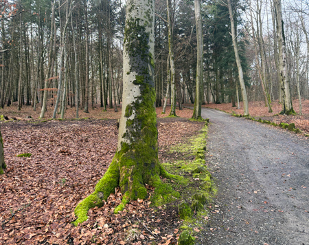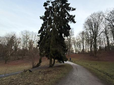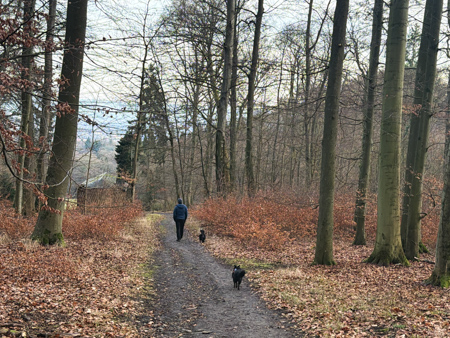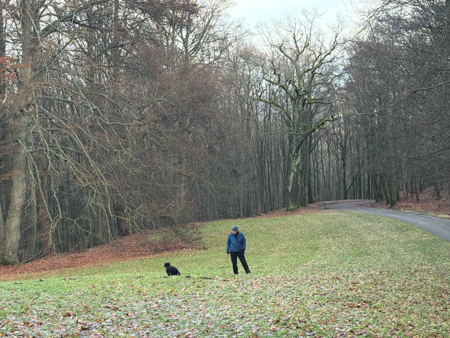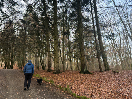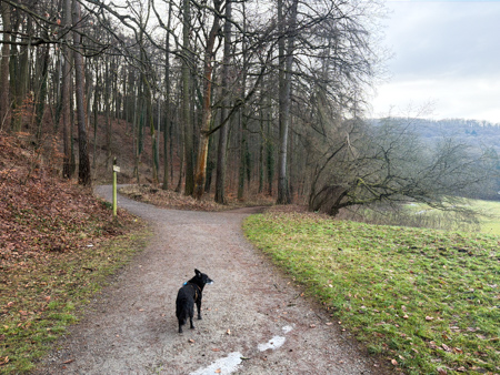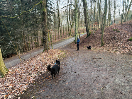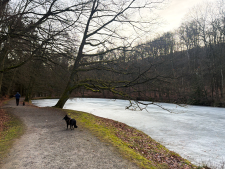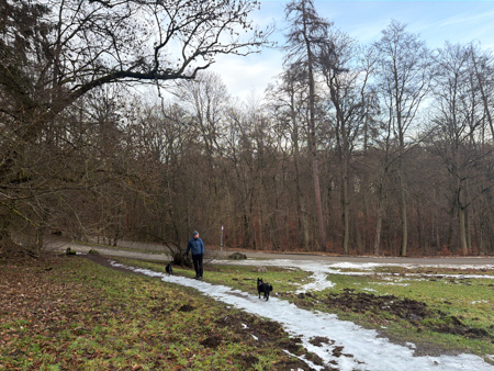 Mit Uwe und den Hundis bei noch ein weng gefrorenem Eis auf dem Wegen im Bergpark unterwegs.