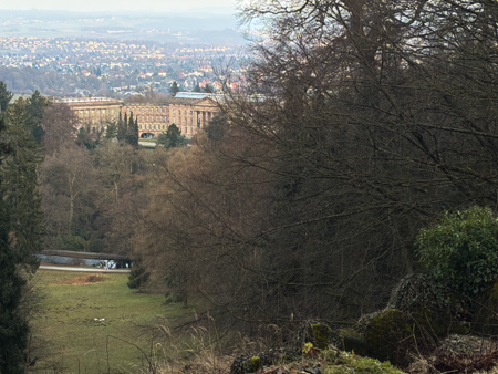 von oben: das Fontänenreservoir, dahinter das Schloß und Kassel