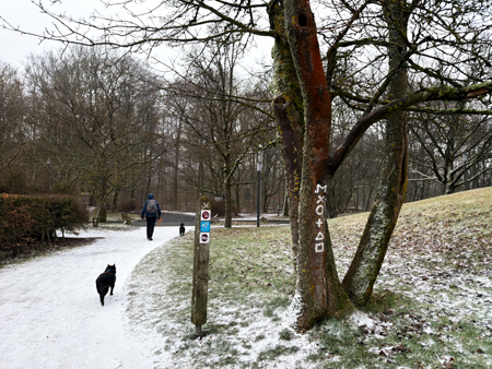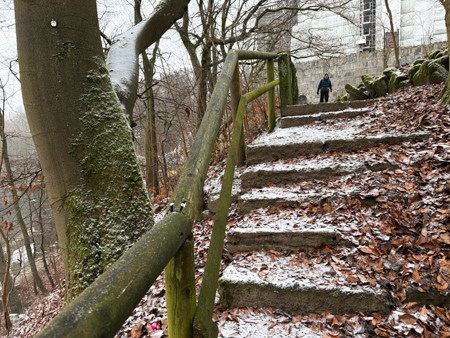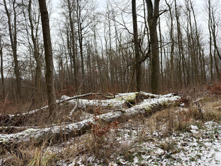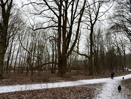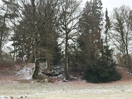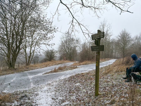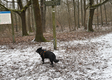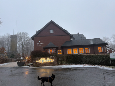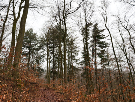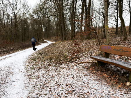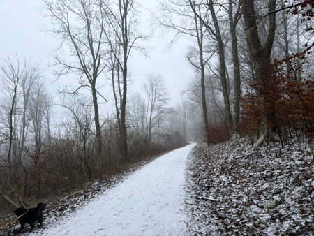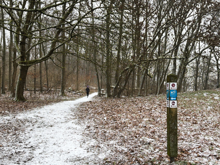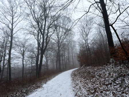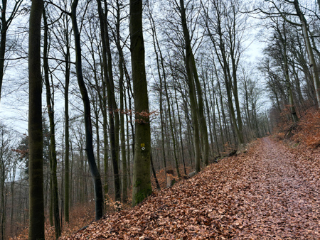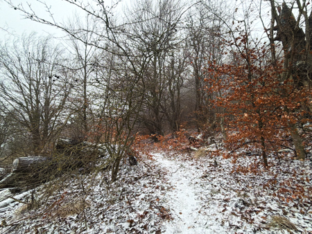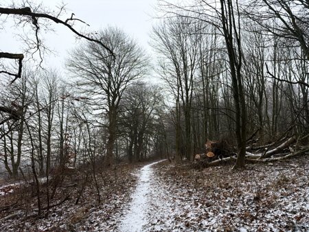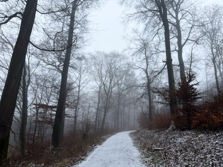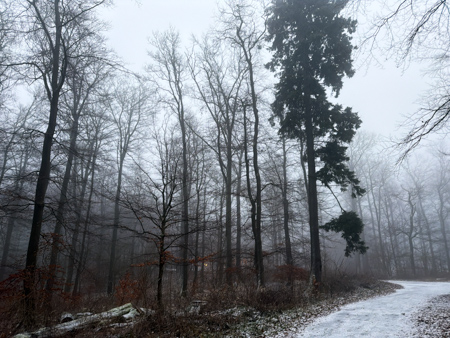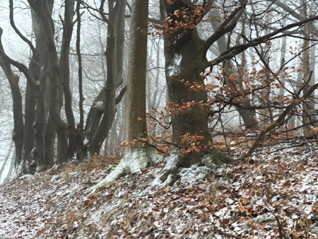 Dann an der Hute angekommen - auch hier Nebel und Schnee. Von der Riesenbank ging es weiter durch den gefrorenen Habichtswald nach rechts zu den Elfbuchen.