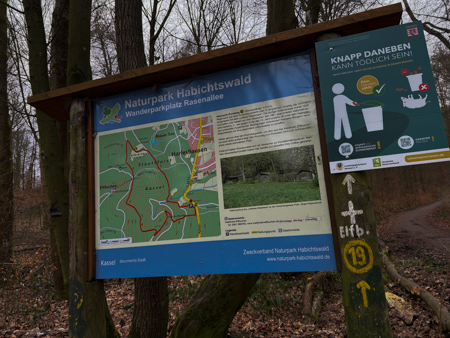Wieder am Wanderparkplatz Rasenallee haben wir das Auto stehen lassen und es ging über Fuchslöcher im Habichtswald erstmal Richtung Herkules bergauf.