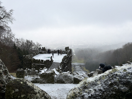 Der Herkules mit Blick in die nebelverhangene Innenstadt Kassel.