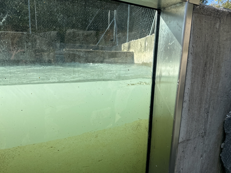 Dann gehts Treppenstufen runter und man sieht die Isar durch einen eingeschlossenen Bereich in verschiedenen Farben - grün und Hellgrün.