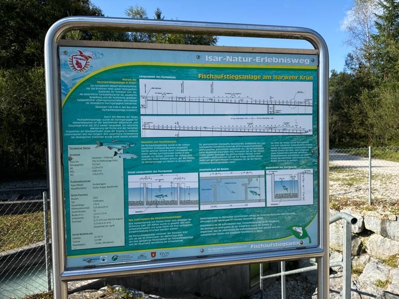 Hier wird auch erklärt das die Aufwanderung der Fische stets entgegen der Strömung stattfindet. Der Abfluss wurde so gewählt das auch schwimmschwache und junge Fische mit ihrerer verfügbaren Schwimmleistung stromauf wandern können. Die Anlage verbindet den Stauraum in Krün und die Isar im Unterwasser der Wehranlage Krün. |
