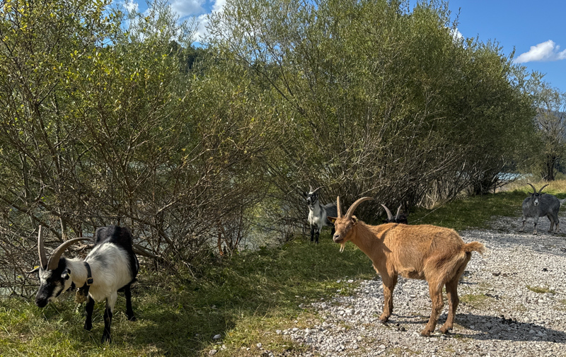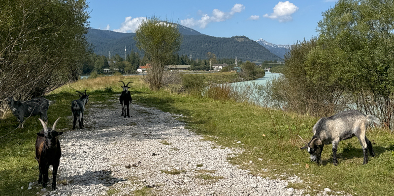 da bin ich hergekommen, von der Flößer-Brücke, links sind die Ziegen