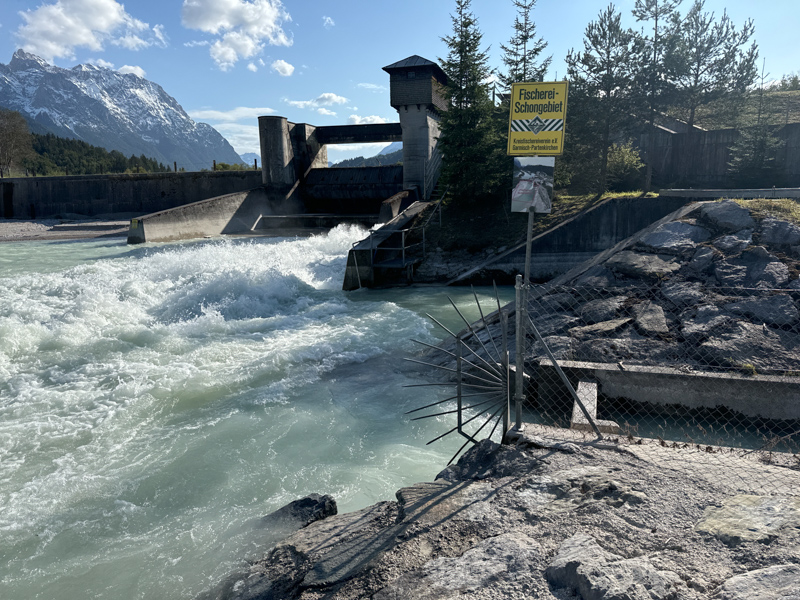 Hier an der Wehranlage Krün (1) wird ein Teil des Wassers der Isar ausgeleitet. Über den Isarkanal fließt es durch Krün und den Wallgauer Stollen zum Sachensee und von dort über das Kraftwerk Obernach (2) in den Walchensee.