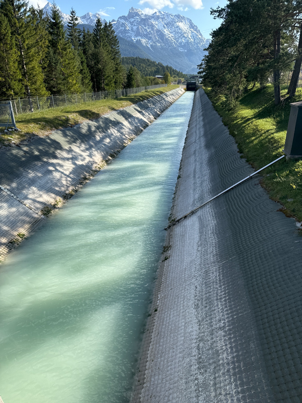 hier wird unterhalb der Mitfahrbank die Wasser-Energie der Isar erzeugt und wohl weitergeleitet