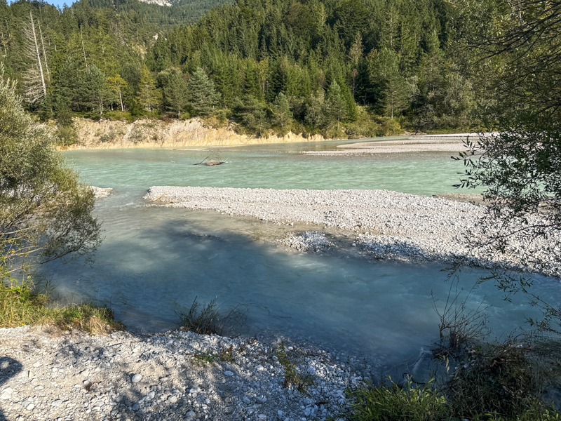 Würde ich weiter gehen - links - wäre ich nach 3 Stunden am Vorderriss und vorher in Wallgau am Isarsteg. Da ich den Wald laufe komme ich am Isarstausee an, in den Wiesen auch zum Isar-Stauwehr.