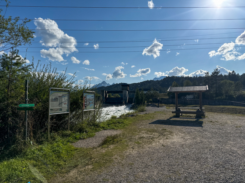 zum Sitzen vor dem Wehr - Schautafeln an der Isar - zurück nach Krün geht es wieder zurück zum Erlebnisweg, oben sieht man Stromleitungen