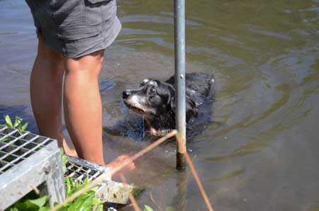 Theo überlegt gaaaaanz lange, ob er reinspringt, weil ich ja drin bin und ihn rufe.... Irgendwann versucht er es und wird abgetrieben. Kann sich grade noch an Gestrüpp festhalten bis ich ihn rette. Habe ihn dann am Geschirr mitgenommen ;-)