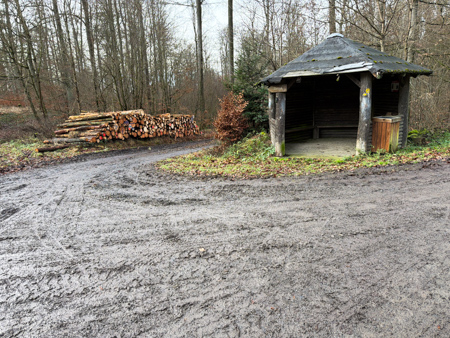 da steht das Geät - daneben eine überdachte Hütte und Matsch überall