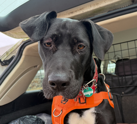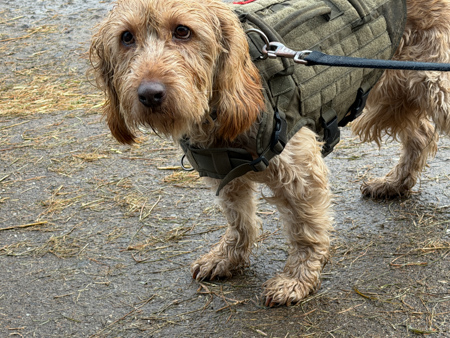 Meine Cami lief frei auf dem großen Hof herum bis sie mal verschwunden war, dann wurde sie zu Uwe gebracht. Milow war an der Schleppleine unterwegs. Wir waren mal kurz im Umkreis laufen. Beim Regen verbrachten sie einige Zeit im Kofferraum. Uwe war bei ihnen.
